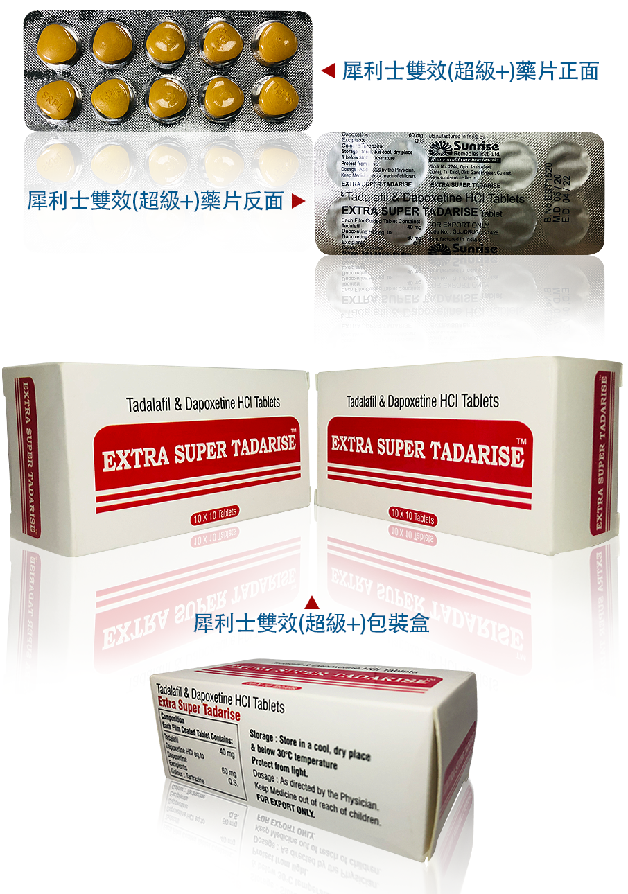 Super Tadarise印度超級雙效犀利士是一種強大的藥物,逐漸成為台灣眾多男士的認可和青睞,它的效果非常顯著,可以幫助男性治療陽痿和早洩。 印度Super Tadarise雙效犀利士成份為他達拉非與達泊西汀。每1粒SUPER TADARISE超級雙效犀利士包含他達拉非40mg(1粒犀利士)+ 達泊西汀60mg,具有助勃與延時雙重功效。因其效果非常猛,建議房事提前1-3小時服用,並且配一大杯溫開水。Super Tadarise超級雙效犀利士效果怎樣?